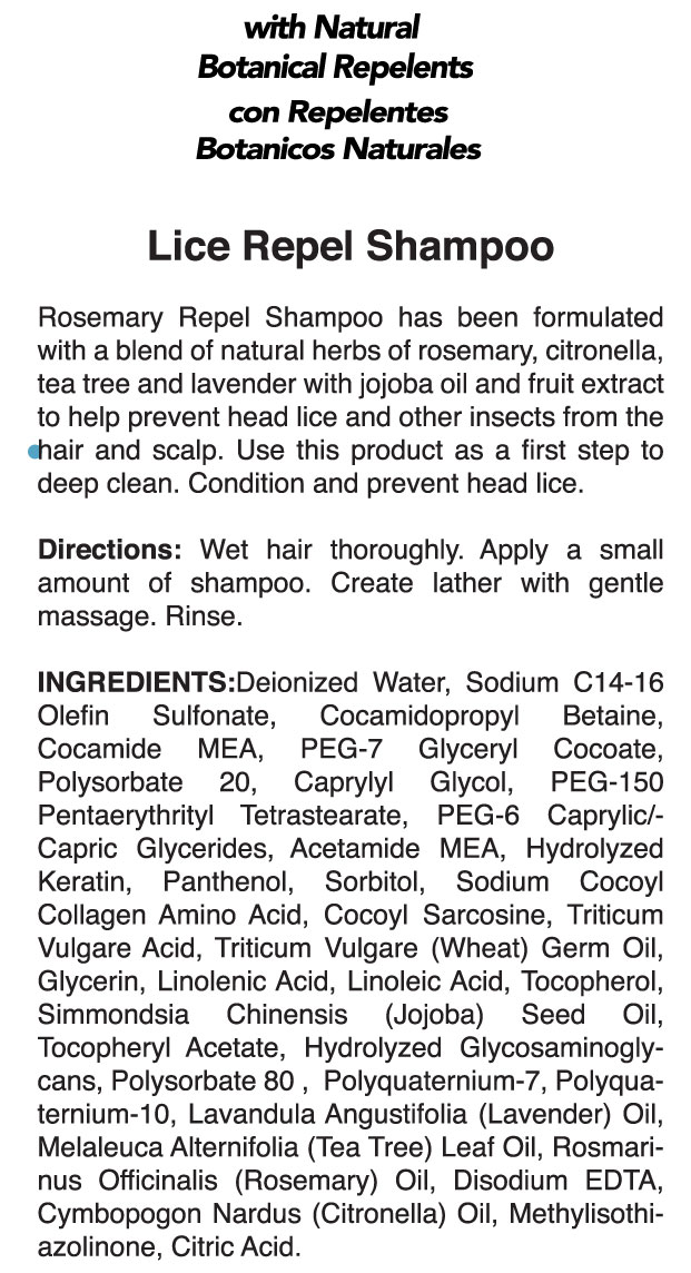 Rosemary Repel Shampoo has been formulated with a blend of natural herbs of rosemary, citronella, tea tree and lavender with jojoba oil and fruit extract to help prevent head lice and other insects from the hair and scalp. Use this product as a first step to deep clean. Condition and prevent head lice.